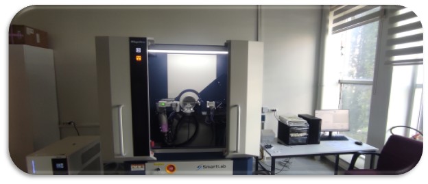 Kurulum: Cu anotlu X-ışını tüpü (Cu Kα, λ ≈ 1.5406 Å) ile çalışan sistem, yüksek kararlılık ve tekrarlanabilirlik sunar. 6’lı otomatik örnek değiştirici (ASC) ile çoklu numune ölçümleri gerçekleştirilebilir. Refleksiyon (Bragg-Brentano), transmisyon ve ince film analizlerine yönelik paralel demet (PB, Parallel Beam) modu sayesinde farklı ölçüm geometrileri desteklenir. Sistem, χ (chi), φ (phi) ve Z eksenli örnek sahnesi ile çok eksenli hizalama imkânı sunarak doku (texture) ve kalıntı gerilme (residual stress) analizlerinin hassas şekilde yapılmasına olanak tanır. Dedektör tarafında yer alan D/teX Ultra 250 (DTEX-250) lineer dedektör, geniş aktif alanı (~250 mm) ve yüksek sayım hızı ile hızlı ve yüksek duyarlılıklı veri toplama imkânı sağlar. Yüksek çözünürlüklü ölçümler için Ge(220) çift yansımalı (2-bounce) monokromatör ile HRXRD analizleri gerçekleştirilebilir. Konfigürasyon; HRXRD, X-ışını yansıma (XRR), gerilme ve doku analizleri gibi ileri karakterizasyon tekniklerini destekleyecek optik ve mekanik altyapıya sahiptir.